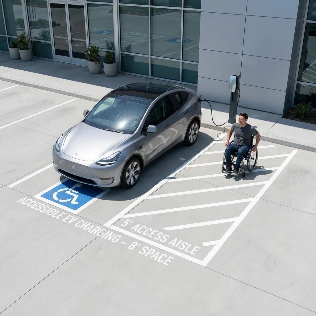 Proper signage isn't just helpful - it's required. Accessible EV charging spaces need specific symbols, height requirements for signs, and clear visibility from both the driving lane and parking areas.
